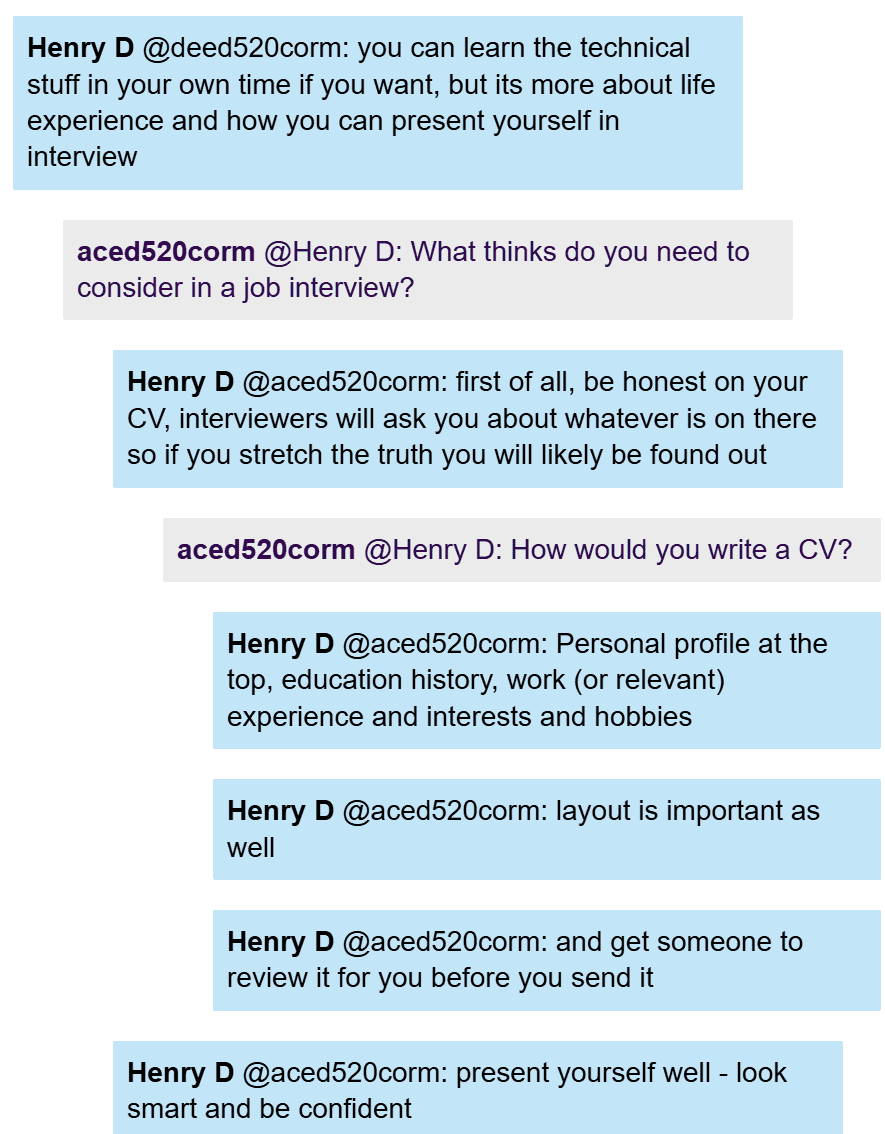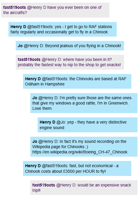 Henry has taken part in 66 Chats this year. He has brought insight into his job in aerospace and defence – from waking up at 6am to work on computer programmes and applications to casually flying in a Chinook. Henry has openly shared tips for students on writing a CV, choosing subjects or career paths – mainly saying: Choose what you enjoy!